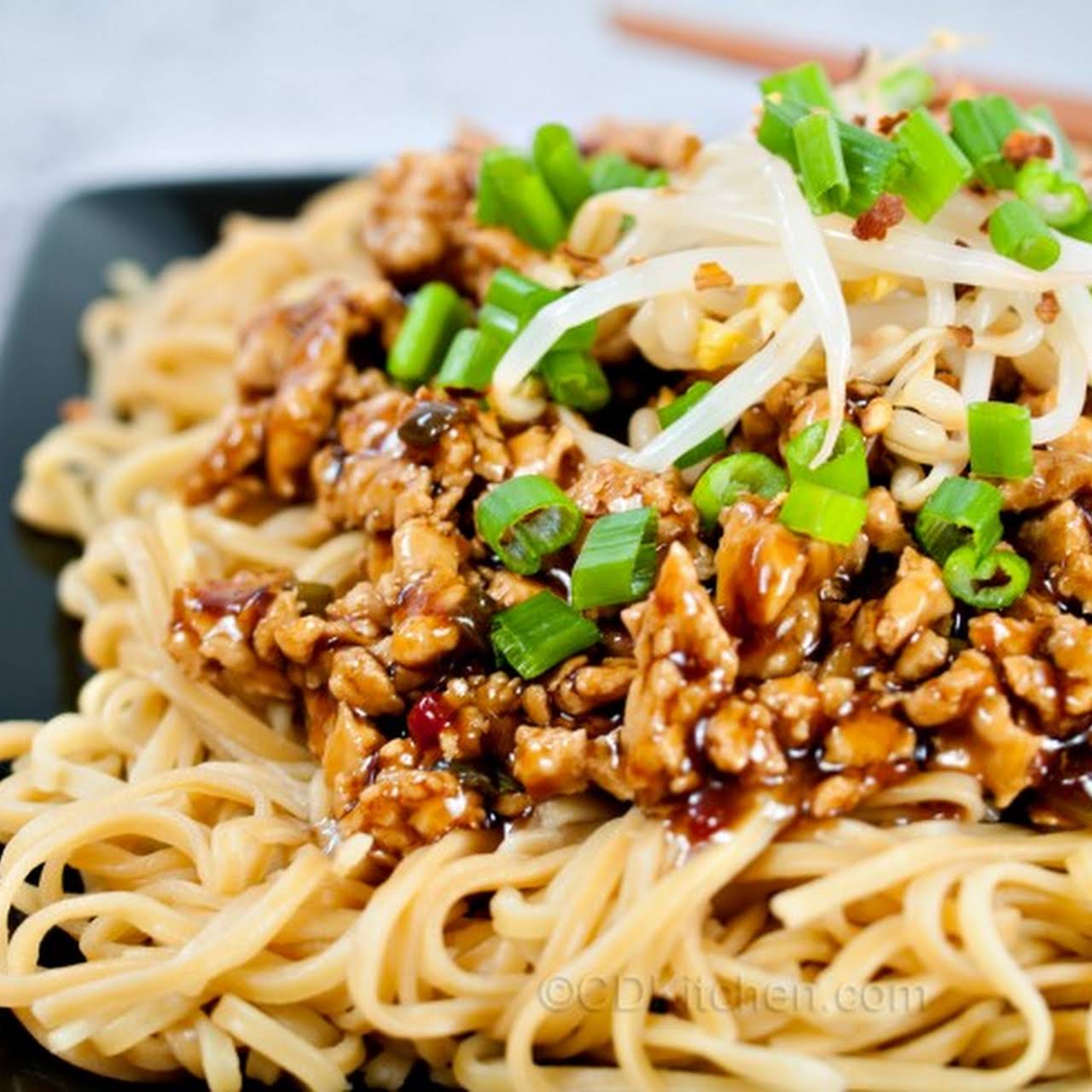 P.f. Changs Dan Dan Noodles in imitation of Noodles, Oil, Green Onion, Garlic, Chile Paste, ring Chicken, Egg Noodles, Cornstarch, Liquid, Soy Sauce, Cooking Wine, Oyster Sauce, Sugar, Chicken accrual